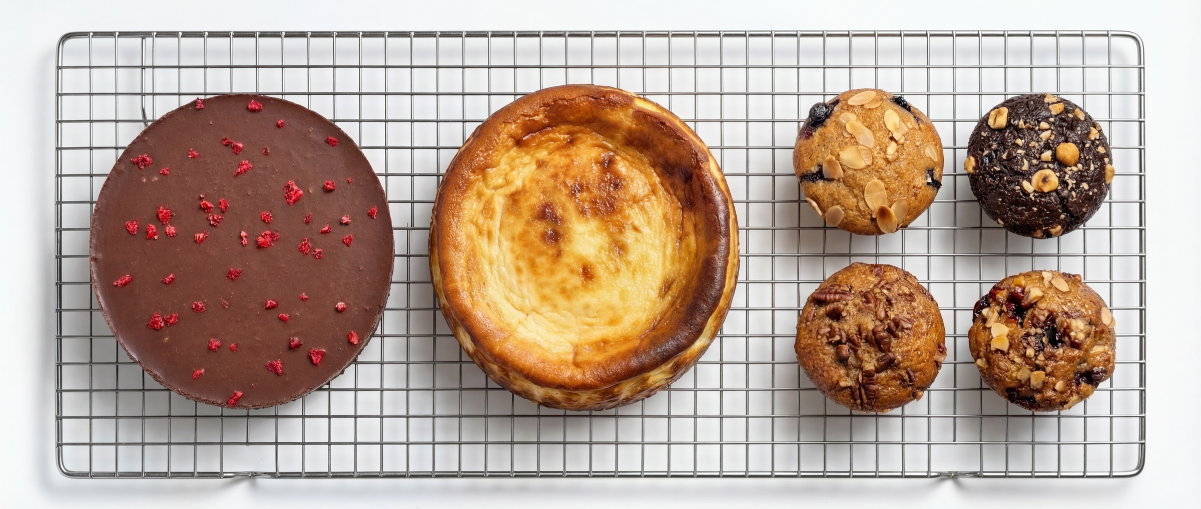 מהקאליבו ופטל (טבעוני וללא סוכר!) ועד עוגת הגבינה הבאסקית המפנקת, דרך פיסטוק לימון חמצמץ ומאפינס טבעוניים. כל ביס הוא הוכחה שאפשר ליהנות מקינוחי עילית – בלי טיפת קמח לבן.
